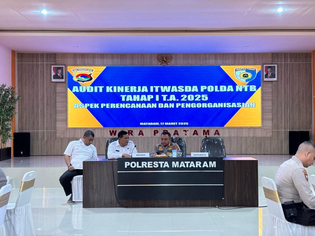 Media Analis Indonesia, Mataram – Kapolresta Mataram, Kombes Pol. Dr. Ariefaldi Warganegara, S.H., S.I.K., M.M., CPHR., CBA., CHRM., mengikuti kegiatan audit kinerja tahap I Tahun Anggaran 2025 yang dilakukan oleh Inspektorat Pengawasan Daerah (Itwasda) Polda NTB di Gedung Wira Pratama Mapolresta Mataram, Senin (17/03/2025).