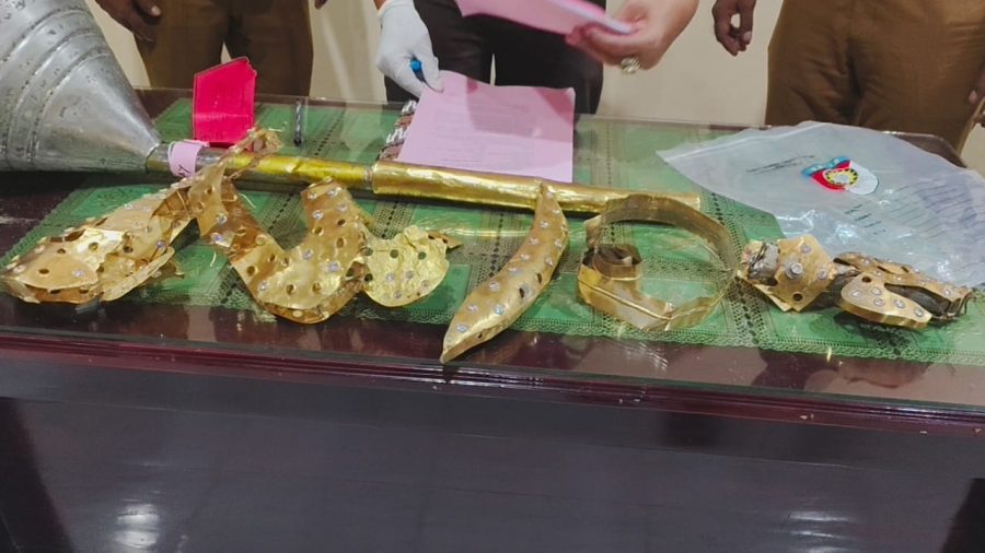 emas senilai 3 kilogram belafadz Allah dalam bahasa arab yang sudah terbagi menjadi 5 bagian dan 52 butir manik-manik yang terlepas atau terpisah dari emas dan satu buah tiang alif dalam keadaan rusak yang disarungkan emas.