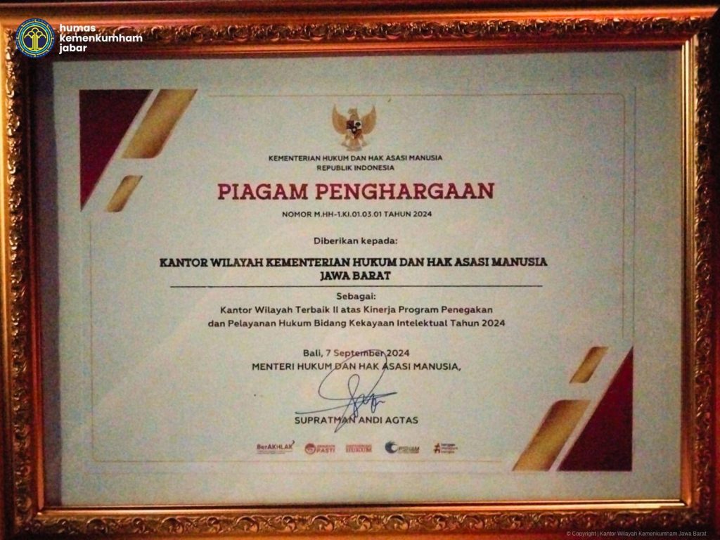 Dalam kesempatan tersebut Kantor Wilayah Kementerian Hukum dan HAM Jawa Barat mendapatkan Penghargaan Terbaik ke II atas Kinerja Program Penegakan dan Pelayanan Hukum Bidang Kekayaan Intelektual Tahun 2024 dari Menteri Hukum dan HAM R.I.