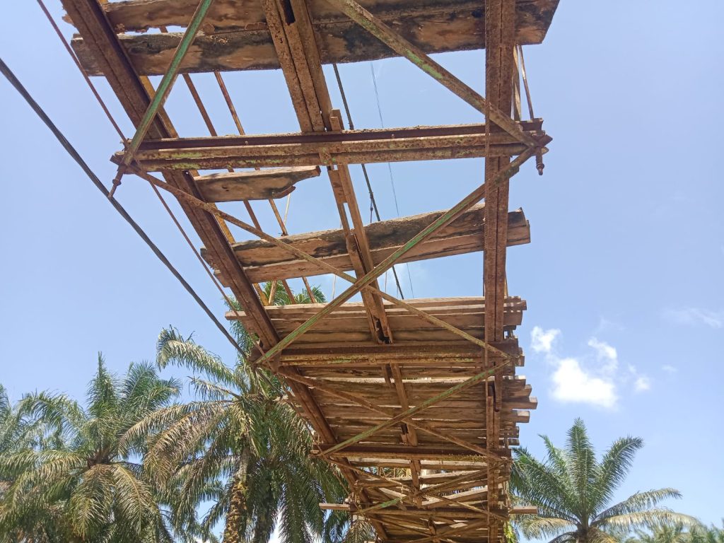 Hasil penelusuran awak media di lokasi jembatan tersebut memang betul kondisinya rusak berat. sehingga timbul kekhawatiran atas keselamatan masyarakat saat melewatinya. dengan kondisi Besi penyangga yang sudah terkikis karat dan besi pijakan yang sudah berkali – kali di ganti oleh papan kayu kini kondisinya sangat mengkhawatirkan karna usia jembatan yang sudah lama tidak ada perbaikan atau perawatan, Kamis (04/07/2024).