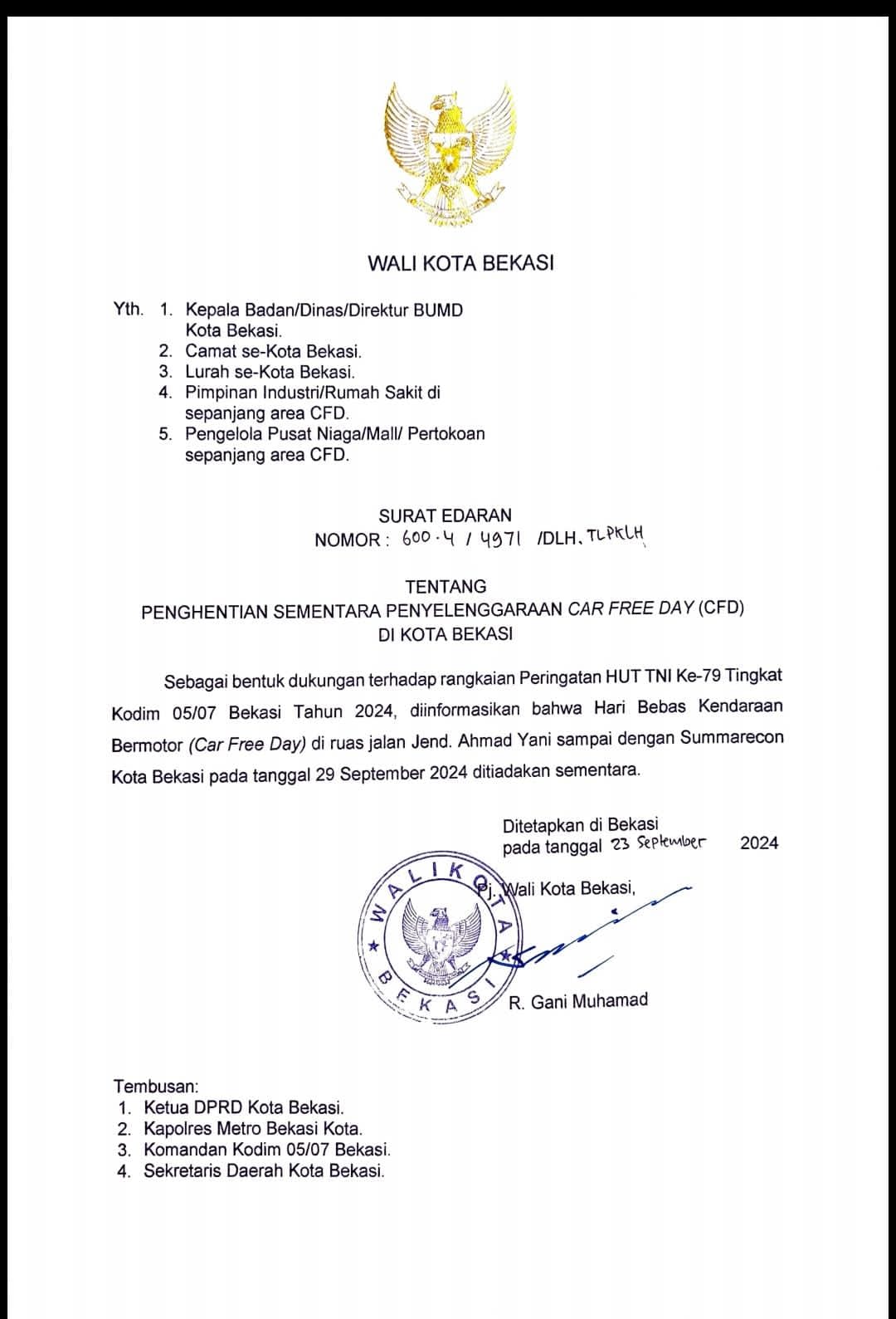 Pemberitahuan diliburkannya CFD disampaikan melalui Surat Edaran Wali Kota Bekasi nomor : 600.4/4971/DLH.TLPKLH tentang penghentian sementara penyelenggaran Car Free Day (CFD) di Kota Bekasi.