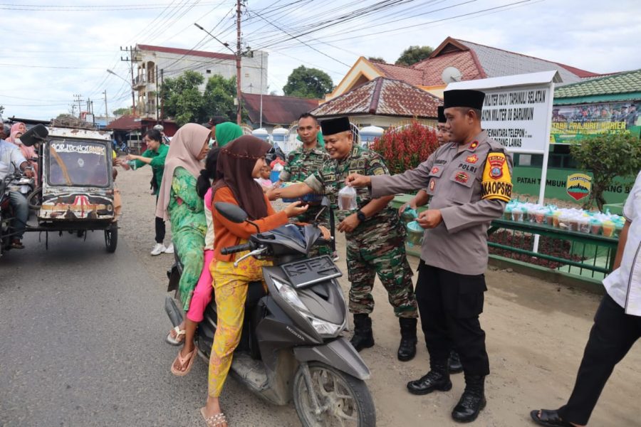 Media Analis Indonesia, Palas – Dalam rangka menyambut Bulan Suci Ramadhan 1446 H, Kodim 0212/Tap-Sel yang di wakilkan Pabung Inf Anhar Jusar, dan Kepolisian Resor Padang Lawas (Polres Palas), bersinergi dalam kegiatan sosial yang bertujuan untuk meringankan beban Masyarakat yang kurang mampu. Kegiatan ini dilaksanakan dengan membagikan Takjil kepada warga yang melintas di sekitar Jalan Ki Hajar Dewantara, Depan Koramil 08/Barumun, Kelurahan Pasar Sibuhuan, Jum’at (28/03/2025) pukul 17.00 sampai selesai.