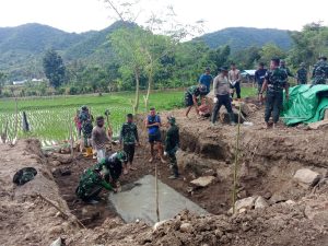 “Pemasangan gorong-gorong bersama masyarakat itu, bertujuan supaya aliran air yang menghubungkan ke sawah petani tersebut,” sebut Kordinator lapangan, Kapten Cba Siswondo.